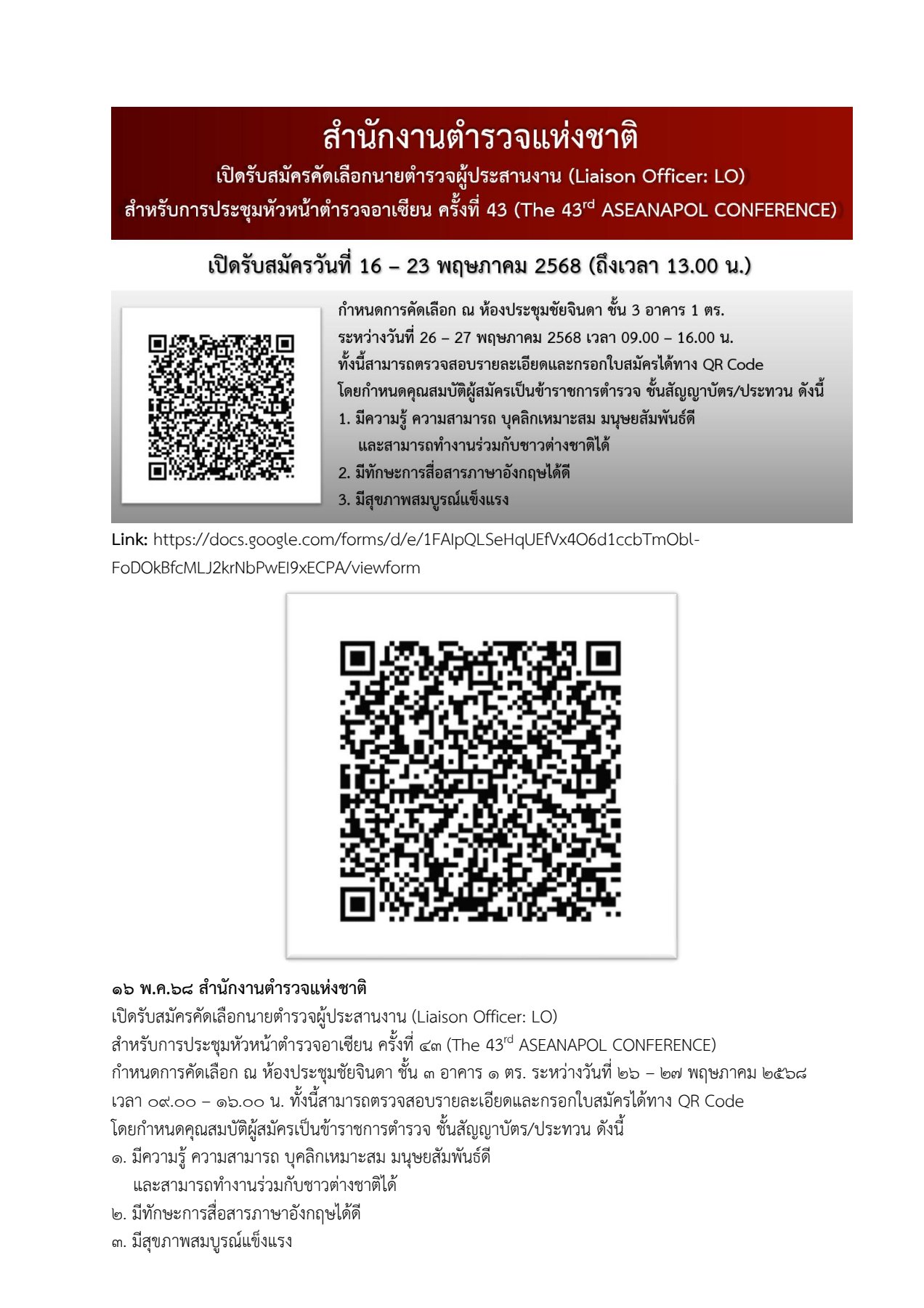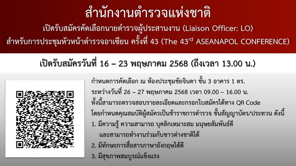 รับสมัคร LO สำหรับการประชุมหัวหน้าตำรวจอาเซียน ASEANAPOL ครั้งที่ 43
